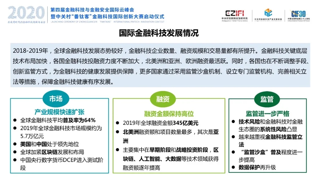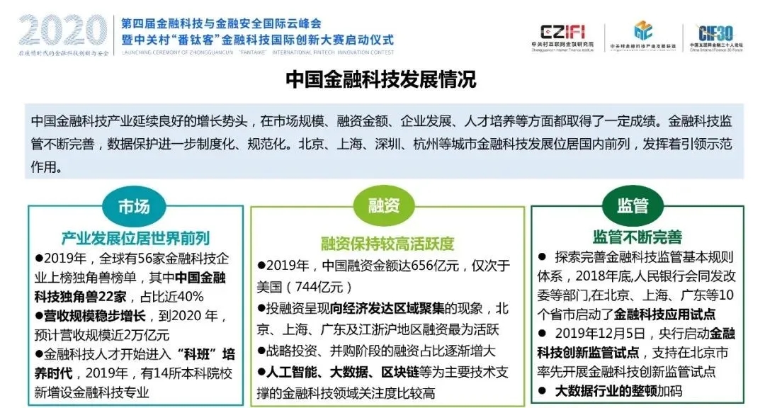 我国金融科技产业延续良好的增长势头,在市场规模、融资金额、企业发展、人才培养等方面都取得了一定成绩。金融科技监管不断完善,数据保护进一步制度化、规范化。我国积极探索完善金融科技监管基本规则体系,2018年底,人民银行会同发改委等部门,在北京、上海、广东等10个省市启动了金融科技应用试点;2019年12月5日,央行启动金融科技创新监管试点,支持在北京市率先开展试点,2020年4月27日,中国人民银行宣称将在上海等6市(区)扩大金融科技创新监管试点,监管工作不断走向深入。