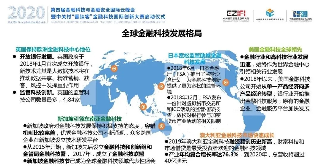 从全球发展格局来看,中国金融科技发展处于世界领先地位,美国、英国、新加坡、澳大利亚和日本在金融科技领域积极布局且各具发展特色。英国保持欧洲金融科技中心地位,其开放银行和监管科技的创新发展具有先发优势。新加坡政府开放包容的态度为金融科技发展注入活力,使其成为东南亚金融科技最发达的地区之一。澳大利亚金融科技市场增长迅速,2019年金融科技融资额创历史新高。日本制度先行,推动金融科技稳步前行。