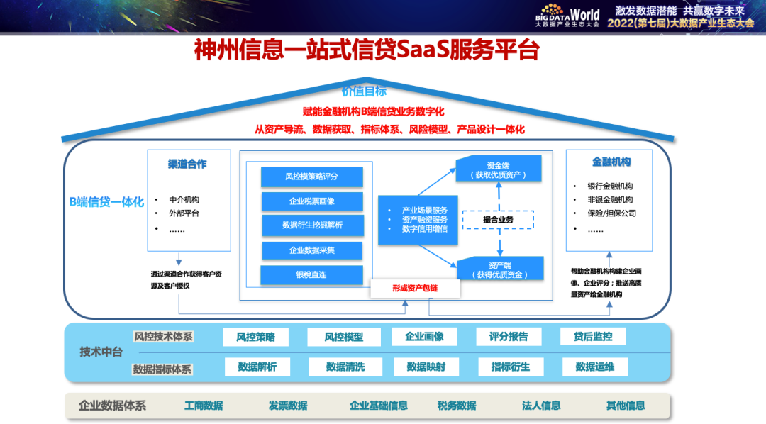 近日,由中国电子信息产业研究院指导,中国大数据产业生态联盟、赛迪传媒主办的2022(第七届)中国大数据产业生态大会在北京召开,本届主题为“激发数据潜能 共赢数字未来”。会上,神州信息中小微场景金融首席专家辛园做题为《大数据赋能中小微场景 ,一站式信贷SaaS服务平台》的主题演讲