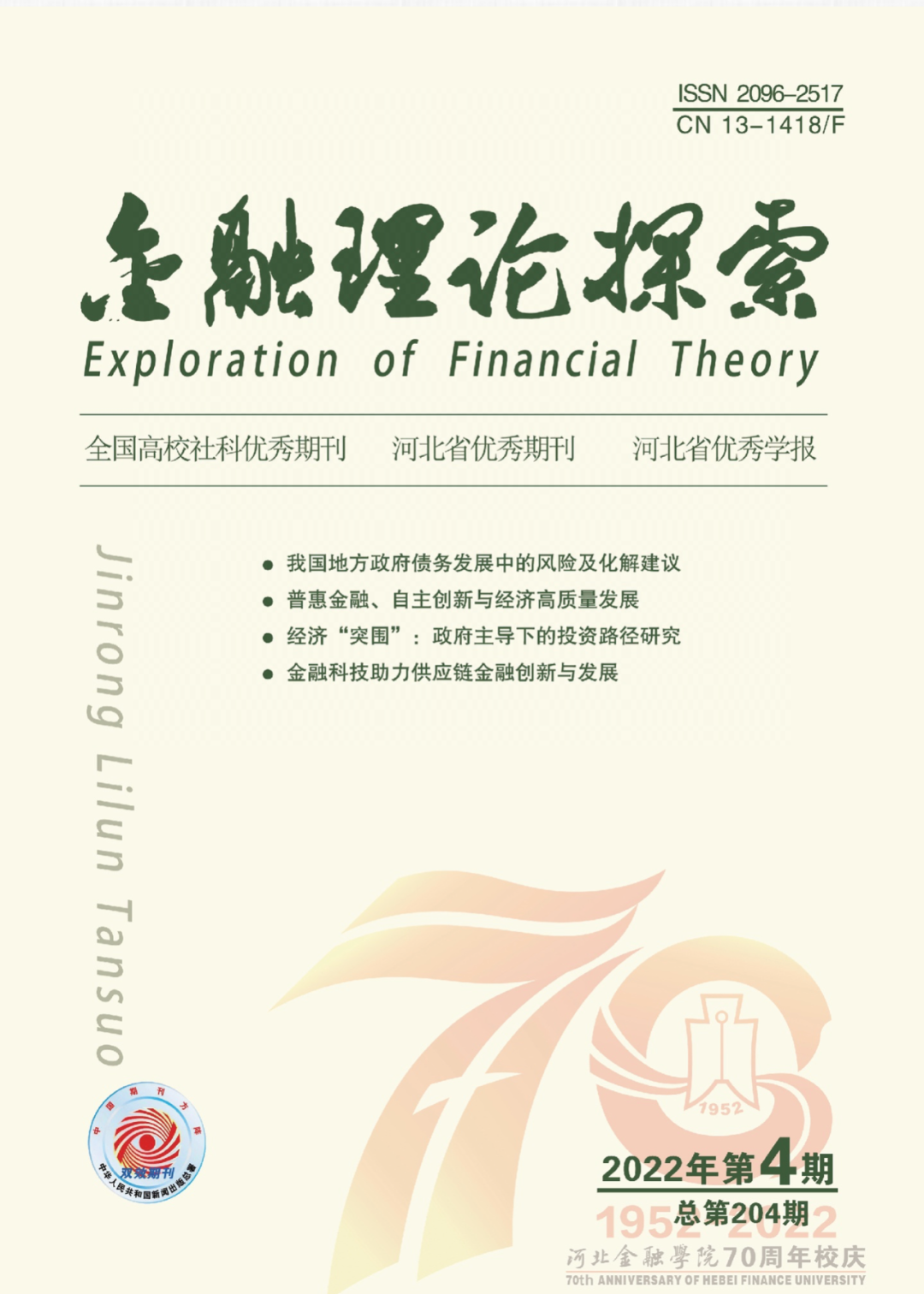 《金融理论探索》是由河北金融学院主办、面向国内外公开发行的金融学术期刊。致力于建设金融经济理论、扶植金融学人。连续四次被评为全国优秀社科学报,多次被评为河北省优秀期刊和河北省高校优秀学报,曾被评为河北省“十佳”社科期刊,并入选中国期刊方阵“双效期刊”。