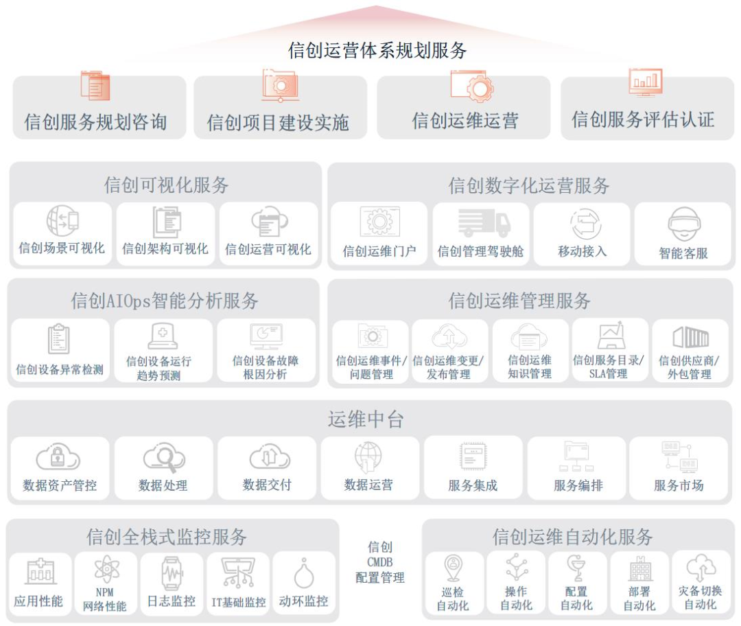 神州信息信创智能运维服务,结合信创业务特点和数字化时代对运维管理的需求,通过“监管控析”一体化智能运维解决方案,以信创客户和信创业务场景为导向,通过全业务的数据和流程整合,实现可视化、场景化、自动化、精细化的智能运维管理,提升用户体验及运维效能。包含信创可视化服务、信创数字化运营务、信创AIOps智能分析服务、信创运维管理服务、运维中台、信创全栈式监控服务、信创CMDB配置管理服务、信创运维自动化服务八大模块。
