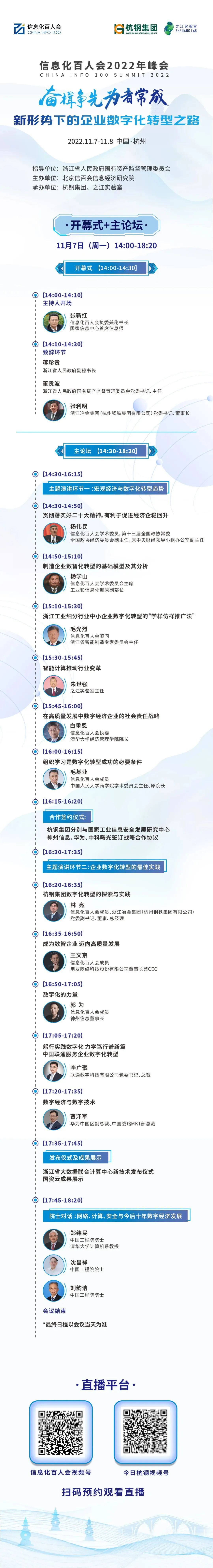 2022年11月7日~11月8日,“信息化百人会2022年峰会”在浙江杭州举行,主题为“奋楫争先·为者常成——新形势下的企业数字化转型之路”。