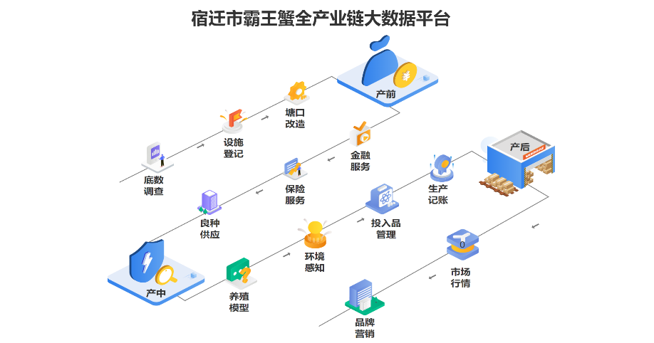 作为中国螃蟹之乡,江苏宿迁大力推进数字赋能霸王蟹产业链转型升级,全力打造新时代的“鱼米之乡”。“宿有千香-霸王蟹”单品全产业链大数据建设,在上游帮扶农户组建设规模化的合作社生产单位,形成大闸蟹科学、标准化的养殖体系;在中游建立行业领先的大闸蟹全流程保障体系,进行全方位品质把控;在下游进行线上线下全渠道精准营销。