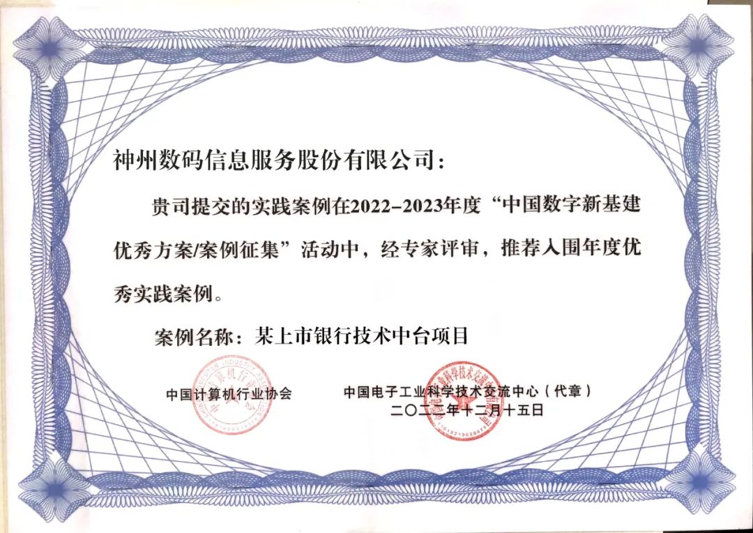 近日,在中国计算机行业协会和中国电子工业科学技术交流中心联合举办的2022-2023年度“中国数字新基建优秀方案/案例征集”活动中,神州信息《某上市银行的技术中台项目》成功入选“中国数字新基建优秀实践案例”。