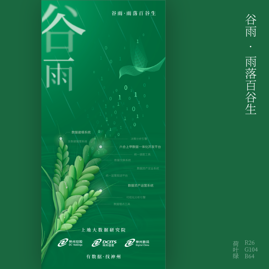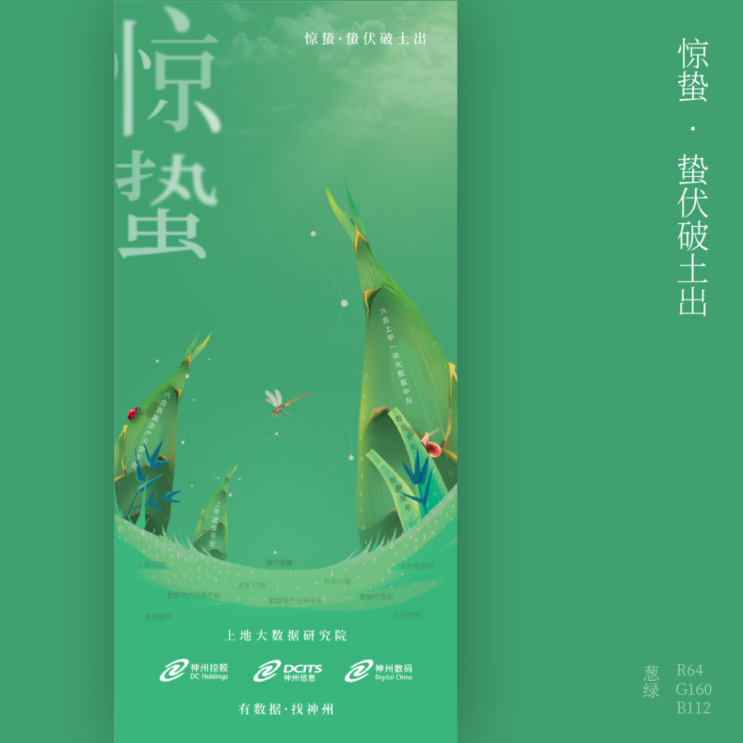 春天是万物复苏、⼤地苏醒的季节,也是播种耕耘的时节。最美的颜色,是中国传统色。春天的主题⾊为绿⾊,上地大数据研究院和数据事业群以经典中国传统⾊为载体,选取了六个极具代表性的绿⾊作为节⽓主题⾊,将中国传统节气文化与当下最前沿的数据科技相结合,在中国传统色背景下,结合团队数据产品核心特点,创作出二十四节气——春季系列海报,试图以艺术手段找到两者的共鸣。