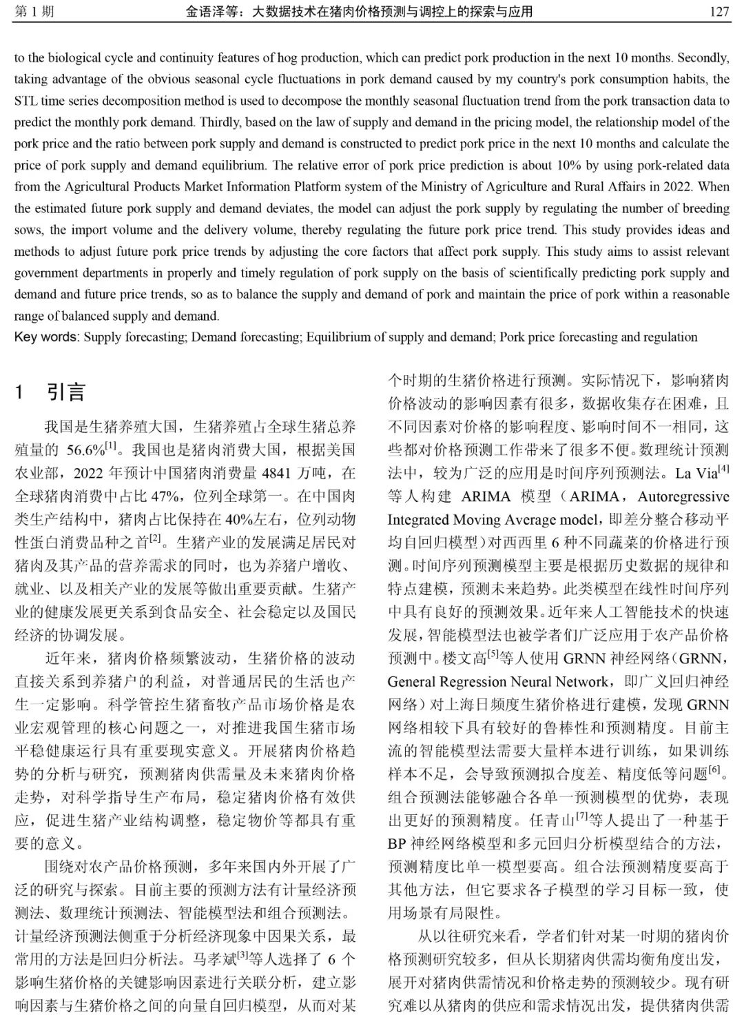 该研究论文提供了通过调整影响猪肉供应量的核心因素来调节未来猪肉价格走势的思路和方法,旨在科学预测猪肉供需量及未来价格走势,协助政府相关部门合理及时调控猪肉供给,促进各时刻的猪肉供需均衡,猪肉价格稳定在供需均衡的合理区间。