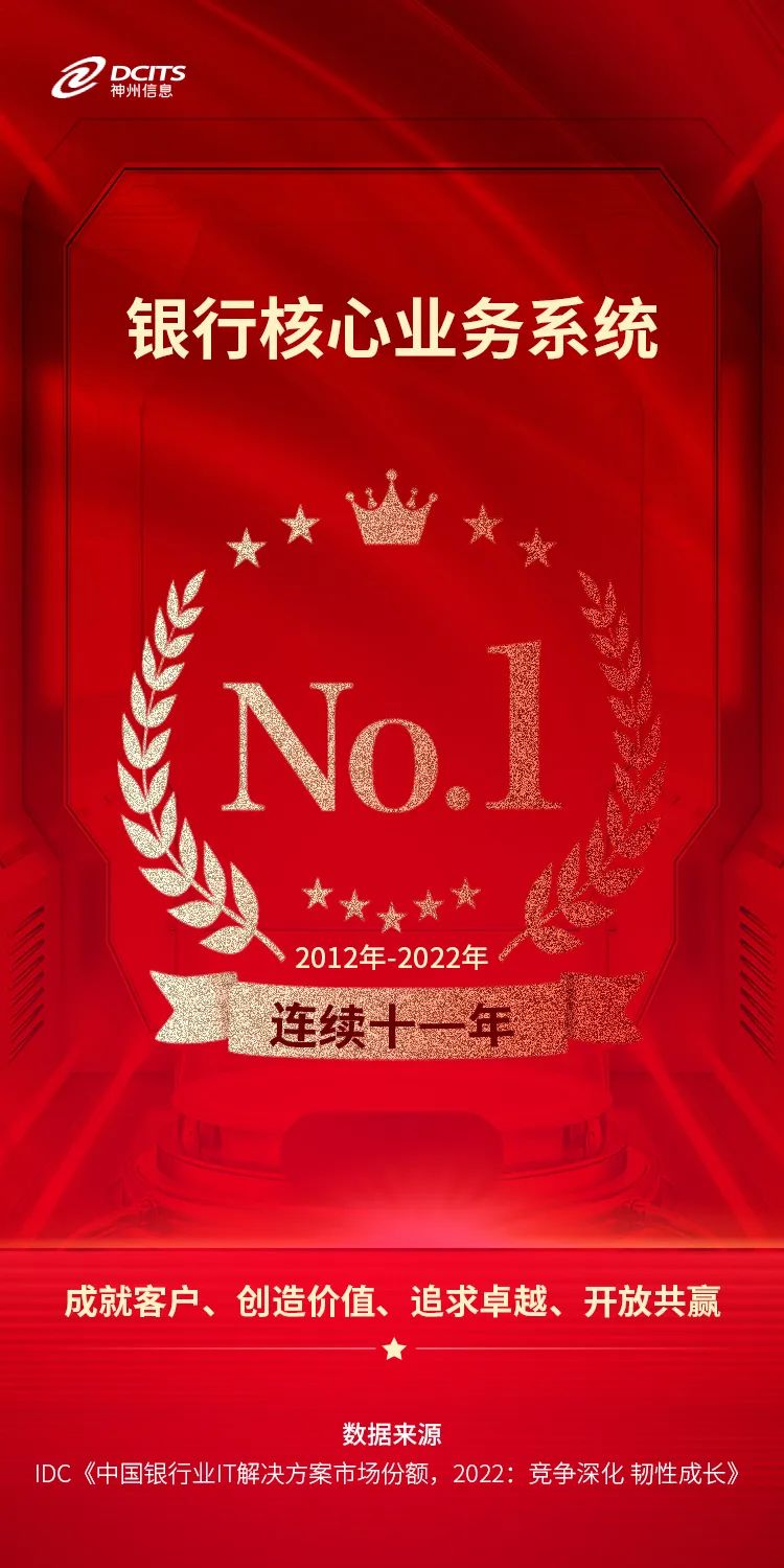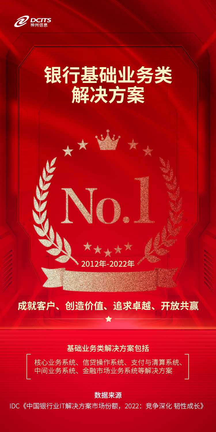 7月13日,IDC 正式发布《中国银行业IT解决方案市场份额,2022:竞争深化 韧性成长》报告,神州信息凭借雄厚的金融数字化实力再次豪取多项市场第一。