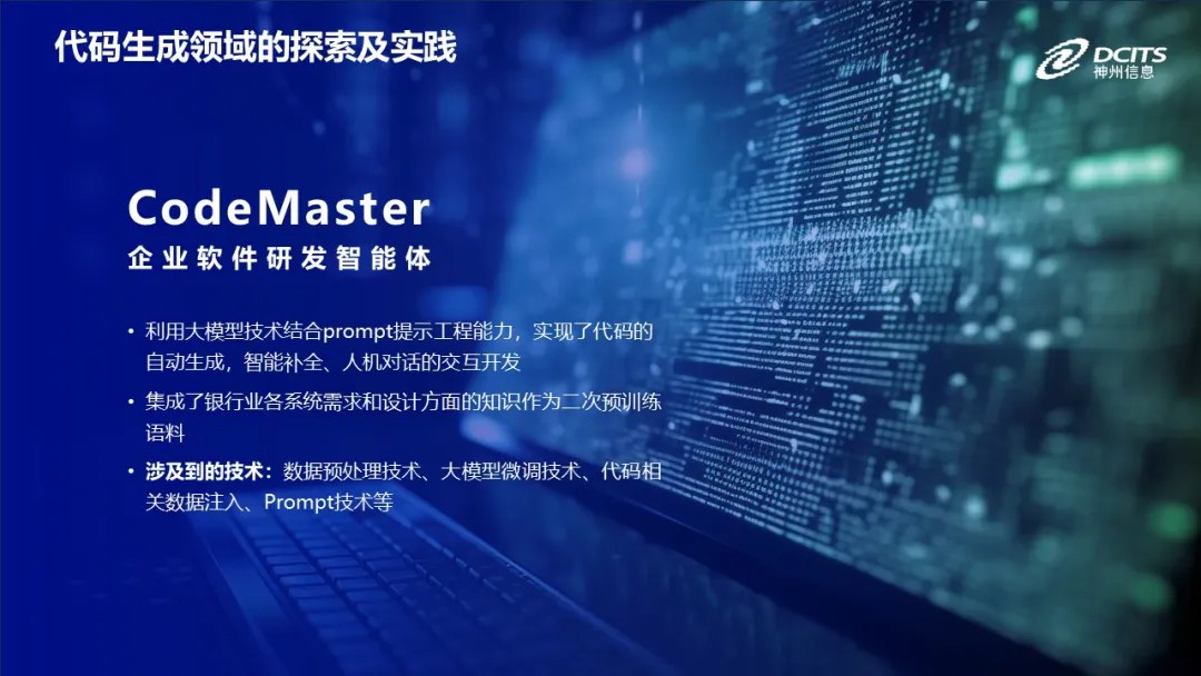 薛春雨分享了神州信息在代码生成领域的探索及实践——“CodeMaster”企业软件研发智能体,一款企业级软件全生命周期研发的辅助工具。利用大模型技术结合prompt提示工程能力,实现代码的自动生成,智能补全、人机对话的交互开发;集成银行业各系统需求和设计方面的知识作为二次预训练语料。CodeMaster在内部进行了大量的实践,其中在单元测试代码生成方面可以降低一半的开发工作量,在功能测试方面可以节省20%左右的工作量。此外,神州信息基于对行业及金融五篇大文章的理解,还推出了企业级数智底座——乾坤,通过云原生技术底座,以及其上层的技术中台、数据中台、AI中台,为金融行业提供全面的、企业级的技术支撑,推动行业数字金融的快速发展。